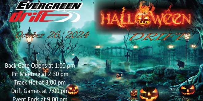 Saturday October 26th Halloween Open Drift & DRIFT GAMES. Bring your costume, decorate your car and come shred some tires at our Halloween Drift! The back gate opens at 1:00 pm with the track hot at 3:00 pm. We will run multiple track layouts just like our regular open drifts. At 7:00 pm we will turn out most of the lights and switch to our Halloween drift games. There is no extra charge to participate in the games. We will finish the evening with an hour more of open drift.