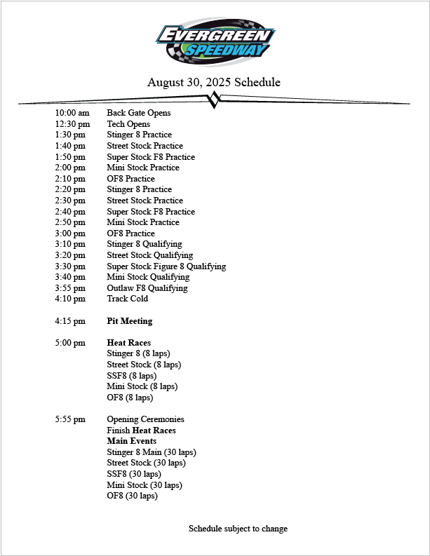 For more information about the Evergreen Speedway, visit the Speedway website. For more about the Evergreen State Fairgrounds, visit the Evergreen State Fairgrounds website.